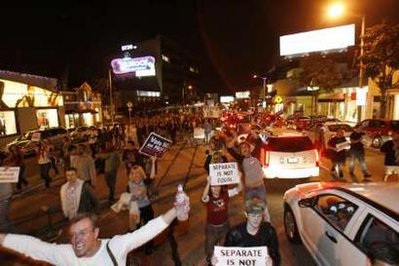 發(fā)表評論  中新網(wǎng)11月6日電 綜合報道,加州數(shù)千名同性戀權(quán)利擁護者當?shù)貢r間5日走上街頭,抗議加州通過的禁止同性婚姻提案。