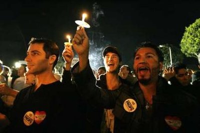 憤怒的人群擁堵在洛杉磯西好萊塢的同性戀聚集區(qū),揮舞標語高喊口號,表達不滿。一位抗議者裸露的胸前寫著:我是八號提案的受害者!