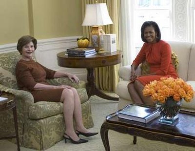 發(fā)表評論  中新網(wǎng)11月11日電 據(jù)星島環(huán)球網(wǎng)報道,美國準(zhǔn)第一夫人米歇爾10日隨同候任總統(tǒng)丈夫奧巴馬到訪白宮,趁著丈夫與總統(tǒng)布什進(jìn)行會談的時候,在白宮范圍內(nèi)到處逛逛看看,包括參觀他們一家兩個多月后便會入住的白宮行政大樓33個房間。為她充當(dāng)向?qū)У,是已?jīng)在白宮住了8年的現(xiàn)任第一夫人勞拉。