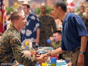 據(jù)CNN報(bào)道,正在夏威夷休假中的美國當(dāng)選總統(tǒng)奧巴馬,昨天慰問了當(dāng)?shù)匾缓\婈憫?zhàn)隊(duì)基地,并和駐扎在那里的士兵及士兵家屬共進(jìn)圣誕晚餐。奧巴馬在美國海軍陸戰(zhàn)隊(duì)駐夏威夷瓦湖島(Oahu)的軍事基地里與士兵們一起共進(jìn)了一個(gè)有火雞,烤牛肉,火腿和香腸的傳統(tǒng)的圣誕晚餐。