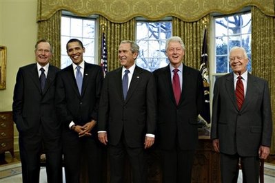 布什和奧巴馬講話(huà)后,五任總統(tǒng)站在美國(guó)總統(tǒng)橢圓辦公室合影,資格最老的卡特和老布什一左一右站在兩邊,每個(gè)人都露出了紳士的笑容。