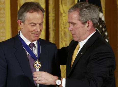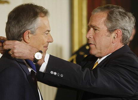 據(jù)英國《每日郵報(bào)》報(bào)道,美國總統(tǒng)布什13日向英國前首相布萊爾頒發(fā)了總統(tǒng)自由勛章。這一勛章是美國授予平民的最高榮譽(yù)。