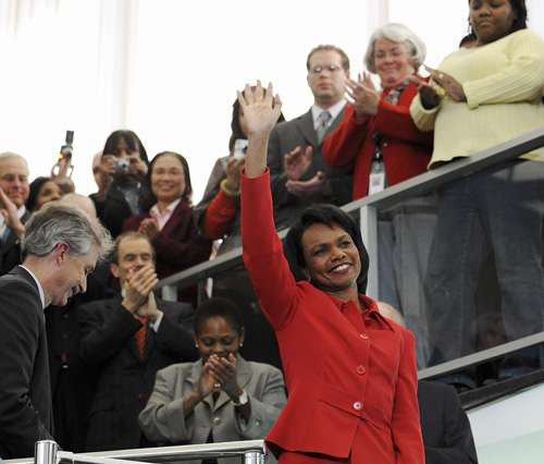 美國國務(wù)院十六日舉行了一場告別會,國務(wù)院全體職員均有出席。會上國務(wù)卿賴斯發(fā)表了一段主題為保衛(wèi)全球自由民主的重要性的簡短演說。然后,她向下屬們說:“你們永遠(yuǎn)都會留在我的腦海里、我的禱告里和我的心里!碑(dāng)時(shí)她面露微笑,但眼里泛著淚光,而且說話的聲音哽咽。語畢,臺下向她報(bào)以熱烈的歡呼和掌聲,她則步下臺階,與各個大使、外交官、安全官員等逐一握手并拍照留念,然后步出大門。