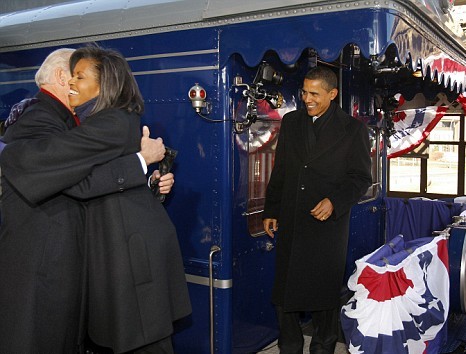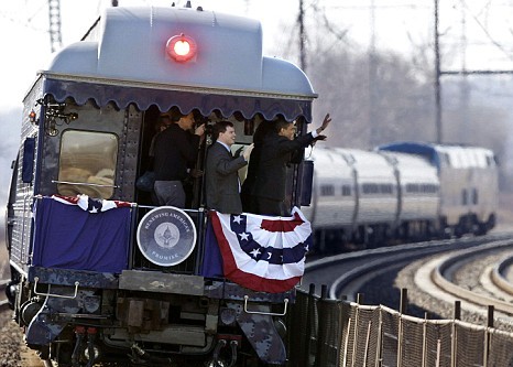 奧巴馬在乘坐專列由費(fèi)城啟程前往首都華盛頓途中,開始總統(tǒng)就職的一系列活動。當(dāng)天也是其妻子米歇爾45歲的生日,他們在火車上慶祝,兩人沿途又向群眾揮手,很多人夾道歡呼,有人舉起寫上“米歇爾生日快樂”的標(biāo)語牌。
