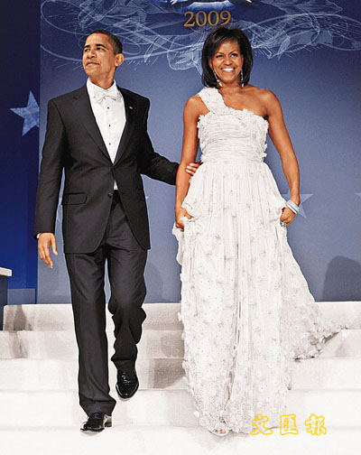 至于奧巴馬本人,則是以黑色禮服、配以白色領(lǐng)結(jié)與襯衫出席舞會,禮服翻領(lǐng)上扣有美國國旗的襟章。