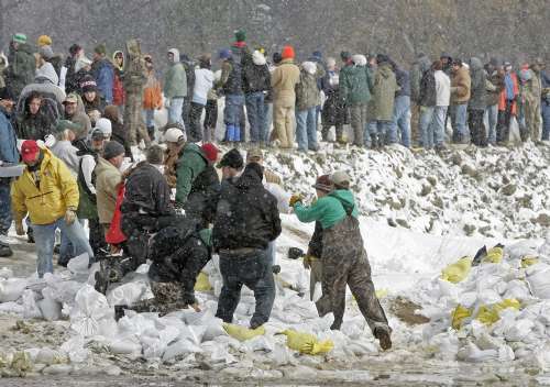在27日早上,法戈市大約150戶居民已經(jīng)撤離,一些醫(yī)院、診所和學(xué)校也關(guān)閉,而數(shù)千名志愿人員及1700名國民警衛(wèi)軍冒寒堆放沙包,加固城市周邊的防洪帶,并準(zhǔn)備在防御物發(fā)現(xiàn)裂縫后作出通報(bào)。另外,在明尼蘇達(dá)州穆爾黑德市,約2660戶居民要緊急疏散。法戈市市長瓦拉克說,他們正在集中力量,全力搶救能夠保護(hù)的每件財(cái)產(chǎn)。法戈變成澤國的風(fēng)險十分高,因?yàn)樵撌形从邪l(fā)展上游區(qū)域城市的周延大型防洪系統(tǒng)。另外,北達(dá)科他州政府亦用炸藥炸開堵塞的冰塊,以疏通受阻而淹沒該州的洪水,并出動救難艇和直升機(jī)救出受困在各地的災(zāi)民。
