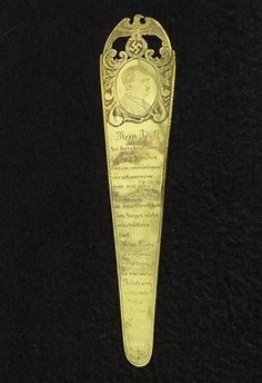 據(jù)稱,這枚金書簽具有特殊的歷史價(jià)值,它是希特勒的情人愛娃1943年送給希特勒的禮物,書簽上方雕刻著希特勒的臉,此外還有棲息在納粹十字記號(hào)上的鷹圖案,書簽上的題字還提到了1943年1月31日德軍在斯大林格勒戰(zhàn)敗后向前蘇聯(lián)軍隊(duì)投降的事件,因此,有人認(rèn)為愛娃送希特勒這枚書簽是為了安撫希特勒當(dāng)時(shí)沮喪的心情。
