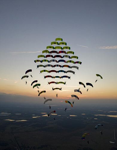 整個過程共計用時11分鐘。在距離地面1220米的時候,隊員們分開,美麗的菱形逐漸分解。