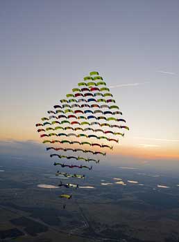 據(jù)報道,為實現(xiàn)這一絕技表演,100名跳傘隊員進行了7年的計劃和訓(xùn)練。他們從5架不同飛行高度的飛機上跳下,在美國佛羅里達幾千英尺外的高空上拼成巨大的菱形,表演壯觀驚人,引人注目。