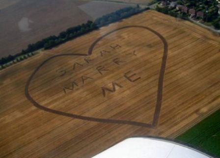 27歲的Robert Szabo在麥田里刻下一行大字:莎拉,嫁給我,然后他再“哄騙”其青梅竹馬的女友坐上一架小飛機(jī)飛上麥田上空。當(dāng)與他交往10年的女友看見了這一巨幅的真情告白時,她震驚了,感動地答道:“我愿意”。