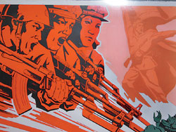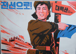 二00七年夏天,朝鮮當代畫家作品和國家畫室制作的宣傳海報在倫敦La Galleria首展時,現(xiàn)場掛滿了朝鮮紅色的旗幟,英倫天空從來沒有那么朝鮮。