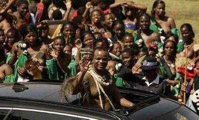 據(jù)香港明報(bào)報(bào)道,姆斯瓦蒂三世(Mswati III)穿著傳統(tǒng)服飾,趾高氣揚(yáng)乘著新款黑色開篷寶馬,率領(lǐng)長(zhǎng)長(zhǎng)的車隊(duì),在首都新建的國(guó)立體育館內(nèi)巡游一周,接受5萬(wàn)觀眾的旗海歡呼。