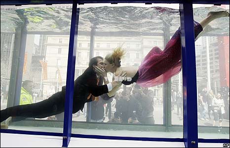 9名穿著時(shí)尚的模特,爬上梯子后,縱身跳入位于悉尼環(huán)形碼頭的水槽,讓攝影師捕捉鏡頭,同時(shí)也取悅路人。
