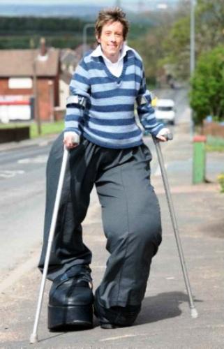 讓她的家人驚訝的是,她在整個童年時期,兩條腿的生長速度都一直比其它身體部位快!最后她再也不能獨立行走了,F(xiàn)在她要借助拐杖,或者借助一輛經(jīng)過特殊改裝的汽車才能出行。塞拉斯的家在英格蘭西北部,她一直找她們家附近的一位鞋匠定做鞋子,因為她的兩只腳也畸形發(fā)育,右腳長16英寸(40.64 厘米),寬7英寸(17.78 厘米),但是她的左腳長僅有11英寸(27.94 厘米),而且整個腳是反長的。不僅如此,塞拉斯的兩條腿長度也不一樣。因此每定做一雙鞋,她都要仔細試穿,反復(fù)試穿直到最后確定鞋樣,整個過程需要花費幾周時間。定做這樣一雙鞋的費用大約是4000美元,塞拉斯必須籌集這些錢,因為她沒有工作。