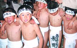 儀式正式開始之前,先舉行了少年裸體節(jié)。當(dāng)?shù)氐闹行W(xué)男生模仿成人也只系一條兜襠布,大喊著走進寺院,接受冷水的洗禮。晚上9時,參加寶木爭奪戰(zhàn)的男人們整裝待發(fā)。這次,記者有幸見識了日本人系兜襠布的過程。小小的兜襠布打開后居然有10米長,按照傳統(tǒng)方法先在腰部橫繞幾圈,然后在兩股間豎繞一道。系兜襠布得有別人幫忙,記者注意到,豎著的這一道要特別用力,系的時候同伴把布背在背上像用力拉車一樣狠狠使幾下勁,才能把兜襠布拉緊。多數(shù)被系的人都疼得嗷嗷叫。據(jù)說,兜襠布沾了水還會緊縮,讓穿的人簡直如同上刑一般。