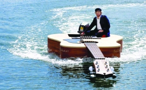 據(jù)報道,喬什的這艘“吉他船”名叫“馬頓號”,馬頓公司是澳大利亞的吉他制造廠商,而這艘“吉他船”正是由該公司設(shè)計定做的,它上面裝有舷外馬達,可以在水中自由地航行。