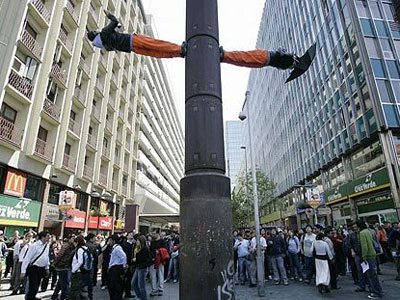 中新網(wǎng)10月16日電 綜合報(bào)道,智利魔術(shù)師Jean Paul Olaverry和Nicolas Luisetti以能使人漂浮在空中的魔術(shù)聞名。15日他們在智利首都圣地亞哥街頭再次展現(xiàn)拿手好戲,他們輕松的站上電線桿的兩側(cè)。