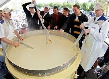 他們把980千克奶酪和420升白酒混合在一起攪拌,然后將成品分成950鍋,分發(fā)給5000名食客。這些觀眾把意大利的經(jīng)典白面包倒在這融化的奶酪里,津津有味地品嘗,場(chǎng)面極其壯觀。