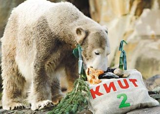 12月5日是柏林動物園北極熊克努特的生日,它開心的聞生日禮物。