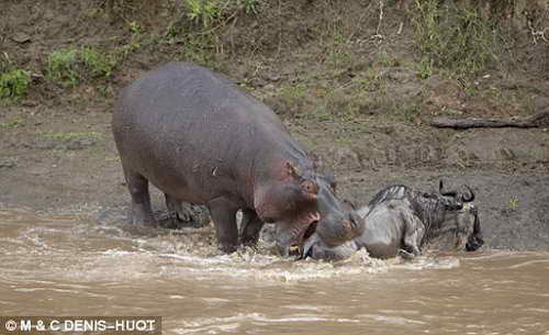 河馬攻擊黑尾牛羚不是為了充饑,事實(shí)上,河馬是食草動(dòng)物。那頭看起來(lái)心情很差的河馬攻擊黑尾牛羚可能是因?yàn)樽约旱念I(lǐng)地遭到侵犯而感到憤怒。(蕭熙)