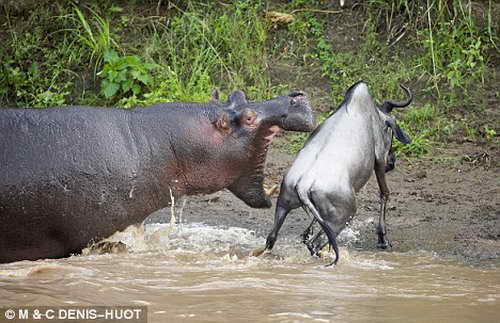盡管那只黑尾牛羚看起來(lái)在劫難逃,不過(guò),很顯然,它最終逃過(guò)了河馬的攻擊。攻擊事件發(fā)生在肯尼亞馬塞-馬拉國(guó)家公園的馬拉河河岸。黑尾牛羚當(dāng)時(shí)正和其它150萬(wàn)只黑尾牛羚行進(jìn)在大遷徙的最后一段路程上,它們?yōu)閷ふ倚碌牟莸貜奶股D醽喅霭l(fā)前往肯尼亞。