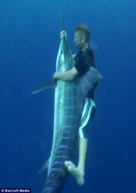 這名男子今年33歲。據(jù)他稱,一生中盡和大魚打交道了,在捕魚表演方面經(jīng)驗(yàn)豐富。有一次在沖浪板上捕魚的時(shí)候,槍魚把他拽出11公里。最驚險(xiǎn)的一次就是從直升飛機(jī)上跳下,徒手捕到一只槍魚。