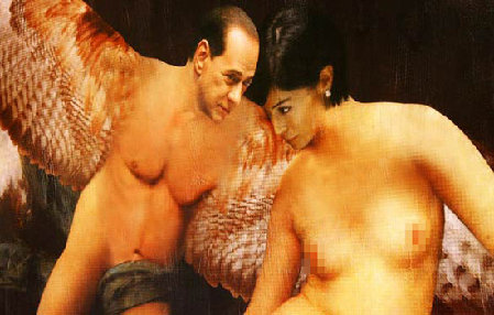 在潘塞卡的這幅作品中,貝盧斯科尼化身赤裸著身體的天使,用巨大的翅膀親昵地摟著意大利機會平等事務部長瑪拉·卡爾法尼亞,含情脈脈地盯著自己的女部下。
