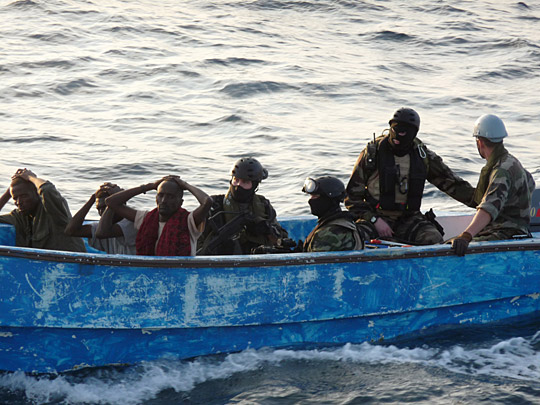 據(jù)一位法國海軍發(fā)言人稱,他們自去年4月份以來已經(jīng)抓獲了57名海盜。亞丁灣索馬里海盜劫持事件在2008年激增11%。海盜問題日趨嚴(yán)重,促使多國派出海軍展開護(hù)航和聯(lián)合打擊海盜任務(wù)。
