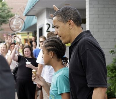據(jù)臺(tái)灣中廣新聞網(wǎng)報(bào)道,這個(gè)星期天是美國的父親節(jié),奧巴馬在父親節(jié)前夕,忙里偷閑,在悶熱的午后,帶著兩個(gè)女兒去吃冰,他似乎短暫拋開了對食物熱量的警覺,大吃澆了糖霜以及杏仁的冰淇淋,第一千金也各自點(diǎn)了不同的冰品,父女三人在餐廳大約停留了15分鐘,奧巴馬還和店內(nèi)顧客握手拍照,臨走又買了一些狗點(diǎn)心,要帶回去犒賞第一家庭的寵物狗。
