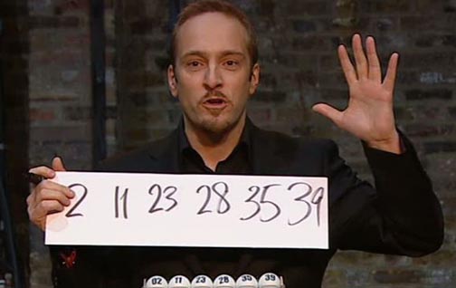 英國電視臺(tái)現(xiàn)場直播了當(dāng)期彩票的開獎(jiǎng)過程,由機(jī)器隨機(jī)選擇箱子中的球。而在另一個(gè)演播室,放置了一臺(tái)電視播放開獎(jiǎng)過程。這位身處另一演播室的神秘“幻術(shù)師”在結(jié)果出來之前,就背對(duì)電視寫下了一組數(shù)字,分別是2、11、23、28、35和39。結(jié)果證實(shí),他所預(yù)測的數(shù)字與中獎(jiǎng)結(jié)果完全一致,令人瞠目結(jié)舌。