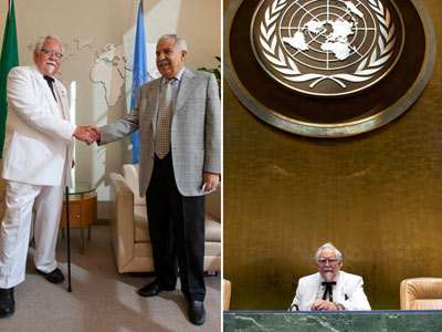 這位名叫湯普森的男子一頭白發(fā),戴著眼鏡,身穿肯德基創(chuàng)始人桑德斯上校標(biāo)志性的白色西裝,打著黑色領(lǐng)結(jié),不知為何成功避開了嚴(yán)密的安保措施,混進(jìn)位于美國(guó)紐約的聯(lián)合國(guó)總部大樓。他提出與聯(lián)合國(guó)大會(huì)新任主席、利比亞前外長(zhǎng)阿里.圖里基握手合影,得到了對(duì)方回應(yīng)。湯普森還成功地在聯(lián)大主會(huì)堂的聯(lián)合國(guó)徽標(biāo)下拍了多張照片,從照片上看,好像在開會(huì)。