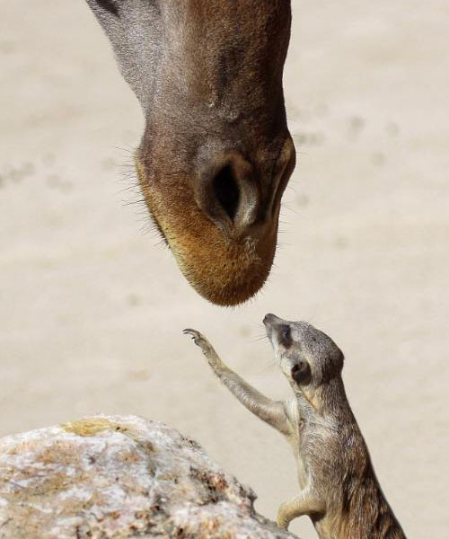 此時(shí),長(zhǎng)頸鹿竟低下頭來(lái)和狐獴對(duì)看,“我從來(lái)沒(méi)看過(guò)這種景象!”阿方索說(shuō),原先他沒(méi)打算拍攝,因?yàn)椤拔也幌M蚱七@種和諧。”不過(guò),當(dāng)長(zhǎng)頸鹿彎身碰到狐獴的頭,看起來(lái)就像狐獴向長(zhǎng)頸鹿索吻,甚至還“伸手”摸摸長(zhǎng)頸鹿。