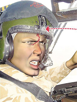 當(dāng)時(shí)塔利班分子的攻勢(shì)很激烈,直升機(jī)盤旋良久才逮到一個(gè)交火較少的機(jī)會(huì)降落下來,不過當(dāng)傷員陸續(xù)登上直升機(jī)時(shí),對(duì)手的襲擊又開始活躍起來。當(dāng)傷員接載完畢,伊恩冒著彈雨再起飛時(shí),一粒子彈剛巧擊中他的頭盔前部一塊用于安裝夜視鏡的金屬架,子彈從這里穿透了頭盔,射中他的眉心。鮮血從伊恩的額頭涌了出來,一直流到他的眼睛。此時(shí)更多的子彈射了進(jìn)來,支奴干的控制臺(tái)被擊中,穩(wěn)定系統(tǒng)無法工作。但伊恩仍然努力控制直升機(jī),繼續(xù)飛行了大約8分鐘,順利降落基地?哲娤⑷耸空f,如果子彈射低一毫米,又欠缺這位機(jī)師的駕駛技術(shù),機(jī)上所有人相信無機(jī)會(huì)生還。