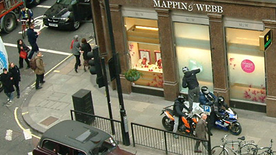 中新網(wǎng)3月10日電 據(jù)外電9日?qǐng)?bào)道,五名騎摩托車(chē)的“劫匪”停在珠寶商店門(mén)前,用大錘砸碎商店櫥窗,在眾目睽睽之下?lián)屪邇r(jià)值5萬(wàn)英鎊的珠寶。這一驚人的場(chǎng)景日前就發(fā)生在英國(guó)倫敦著名的“珠寶一條街”上。