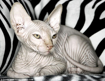 斯芬克斯貓是2005年認(rèn)定的稀有品種,它們無毛,滿身褶皺。斯芬克斯貓脾氣很好,而且在某些方面它們更像狗,比如,容易與人親近而且對(duì)人忠誠。但是這種貓也需要些特殊保護(hù)。比如在夏天,主人需要給它們涂抹防曬霜以免曬傷;在冬天則需要給它們添加衣物來遮體保暖。斯芬克斯貓通常能活到9—15歲。