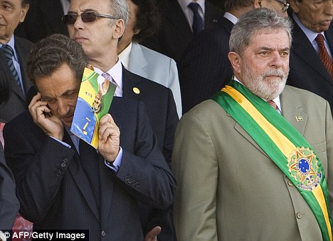 法國總統(tǒng)薩科齊6日至7日對巴西進(jìn)行國事訪問,并應(yīng)邀出席了巴西獨(dú)立節(jié)的慶祝及閱兵活動。閱兵活動中,薩科齊偷接電話被媒體逮了個(gè)正著。試圖用宣傳單擋住自己在打電話的舉動,可謂是“欲蓋彌彰”。