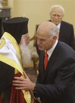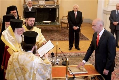 希臘當(dāng)選總理、泛希臘社會主義運(yùn)動(泛希社運(yùn))主席帕潘德里歐6日在總統(tǒng)府正式宣誓就職,并公布了新內(nèi)閣成員名單。