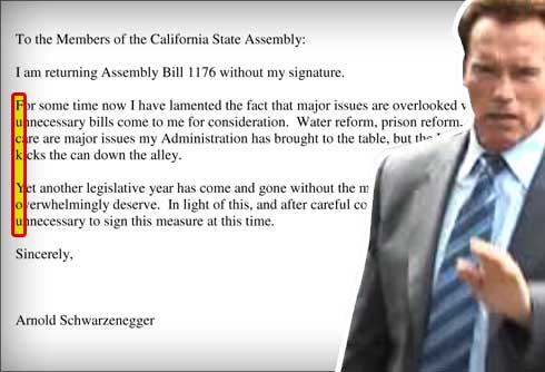 然而,施瓦辛格的過人“幽默感”與反擊方式不僅止步于此。他在否決這項法案的特別咨文中,竟以“藏頭詩”的方式狠狠羞辱了政敵阿米阿諾。從信的正文第二自然段起,將每行左邊第一個字母挑出來,豎著念,就能拼成兩個單詞,而這兩個單詞可謂是全球最廣為人知、也堪稱美國“國罵”的不雅詞匯。可見這位曾經(jīng)對著萬千觀眾大秀肌肉的好萊塢猛男玩起文字游戲來,一點也不含糊。