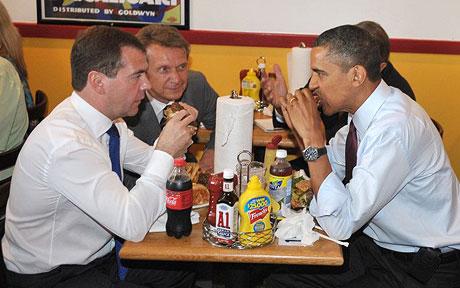 據稱,兩名總統(tǒng)穿著長袖白襯衫,共同來到店點餐口點餐。奧巴馬點了一份芝士漢堡包,里面包著切達奶酪,洋蔥,生菜,番茄和腌菜。還有一瓶冰紅茶。梅德韋杰夫也點了一份芝士漢堡,里面有奶酪,洋蔥,辣椒,蘑菇。還有一瓶可口可樂。兩人還共點了一份薯條。