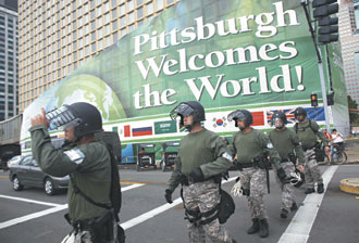 據(jù)當?shù)鼐浇榻B,為確保二十國集團金融峰會的安全,有關方面部署了將近5000人的警力,其中包括約2500名國民警衛(wèi)隊員、1200名州警、870多名匹茲堡市警員以及其他執(zhí)法人員。