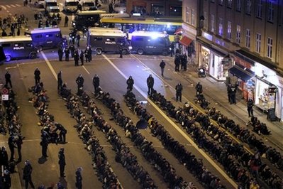 近日來(lái),在哥本哈根舉行的示威活動(dòng)大部分是和平的,但是在當(dāng)天的集會(huì)中,有數(shù)百名身穿黑衣的年輕人在街上投磚頭,砸窗戶,警方對(duì)此進(jìn)行了干預(yù)。防暴警察包圍了鬧事者,要求他們坐在地上,把手放在身后,然后被集體押上警車。