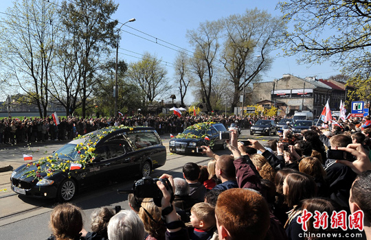 中新網(wǎng)4月18日電 綜合消息,當(dāng)?shù)貢r(shí)間18日下午2點(diǎn)(北京時(shí)間晚上8點(diǎn)),在空難中不幸殞命的波蘭總統(tǒng)卡欽斯基夫婦的國(guó)葬儀式在波蘭南部城市克拉科夫舉行。數(shù)萬(wàn)名群眾聚集在一起,向總統(tǒng)夫婦做最后的“道別”。