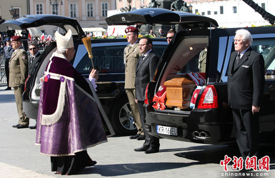當(dāng)天早些時(shí)候,卡欽斯基夫婦的遺體由軍方飛機(jī)從首都華沙運(yùn)至克拉科夫,葬禮結(jié)束后,夫婦二人的遺體將被運(yùn)往當(dāng)?shù)赜兄锨隁v史的瓦維爾宮安葬。