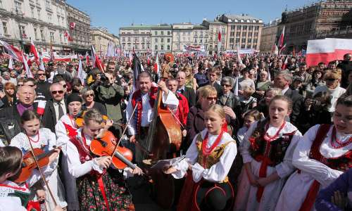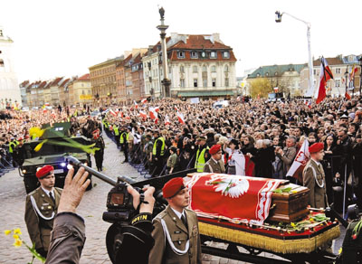 當(dāng)靈車緩慢穿過(guò)克拉科夫狹窄街道時(shí),哀悼者為卡欽斯基夫婦鼓掌、拋花和揮舞波蘭國(guó)旗。卡欽斯基夫婦的遺體,是用飛機(jī)從華沙運(yùn)抵這里的。