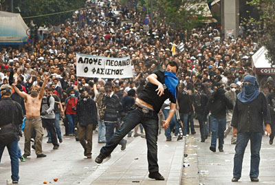 數(shù)萬名來自公職和私營兩大工會(huì)的成員昨日走上雅典街頭,高舉“國際貨幣基金組織和歐盟盜走了一個(gè)世紀(jì)的社會(huì)發(fā)展”、“富人需為危機(jī)負(fù)責(zé)”等橫幅,對政府實(shí)行嚴(yán)厲的財(cái)政緊縮政策表達(dá)不滿。