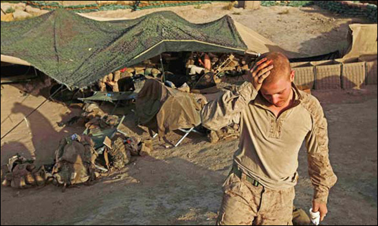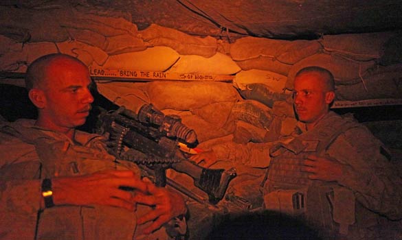 這個觀察哨名為“巖石”,就位于赫爾曼德省哈!ぐ偷卵策壔貣|南部幾百米處,在過去幾個月中,這里一直有2到8名海軍陸戰(zhàn)隊士兵駐扎。這里是一個孤獨(dú)暴露的20米高地,2008年夏季被美軍占領(lǐng)。士兵們不僅需要忍受38攝氏度的高溫,還要全天候輪班守衛(wèi),眼睛時刻盯著沙袋之間的射擊孔,消遣就是看雜志和去臨時體育館,每個周日早晨,通常會受到塔利班的輕武器和火箭彈的襲擊。