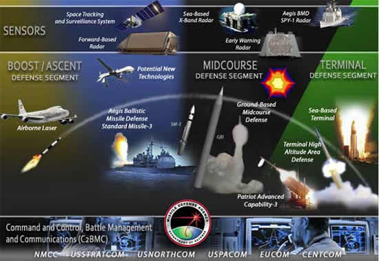 美國(guó)彈道導(dǎo)彈防御系統(tǒng)包含衛(wèi)星定位偵察系統(tǒng)、前沿部署雷達(dá)、X波;走_(dá)、早期預(yù)警雷達(dá)、宙斯盾雷達(dá)系統(tǒng)的預(yù)警探測(cè)系統(tǒng)、空基激光反導(dǎo)武器、宙斯盾平臺(tái)搭載的“標(biāo)準(zhǔn)-3”導(dǎo)彈、無(wú)人機(jī)等新型武器、陸基中段彈道導(dǎo)彈防御系統(tǒng)、;K端防御武器、“愛國(guó)者-3”導(dǎo)彈、終端高空區(qū)域防御導(dǎo)彈系統(tǒng)等武器系統(tǒng)和指揮、控制、戰(zhàn)場(chǎng)管理和通訊系統(tǒng)。