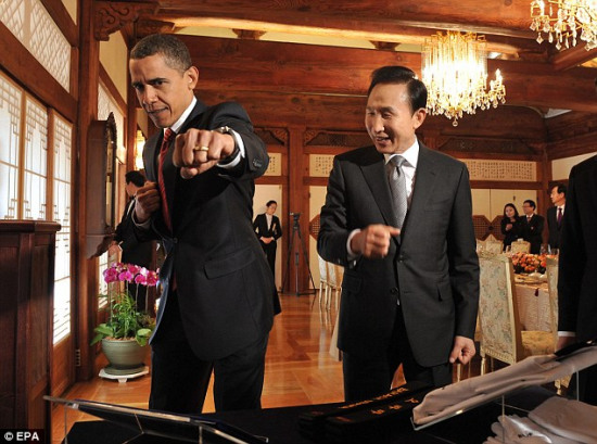 雙方會晤之后,李明博將一套跆拳道制服和一條黑帶作為禮物贈予奧巴馬,奧巴馬隨即擺開跆拳道姿態(tài),大展拳腳,韓國總統(tǒng)李明博在一旁贊賞不已。據悉,2001年,奧巴馬還是伊利諾伊州一名參議員時,就開始了為期4年的武術學習。