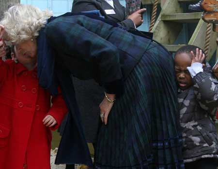 中新網(wǎng)11月21日電 11月19日似乎是卡米拉的“黑色星期四”,在一天之內(nèi)頻頻出丑,首先是用屁股不小心撞到一個3歲男童的腦袋,這個小男孩很不給面子,當(dāng)場哇哇大哭;接著在出席圣誕燈飾雕像的亮燈儀式時,她又因用力過猛,竟然將繩子拉斷。