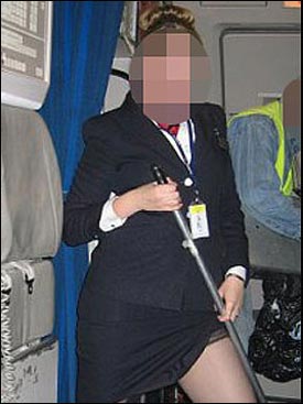 照片中的這些英航空姐穿著獨特的紅、白、藍(lán)色的制服,撩起裙子后丁字褲顯而易見,露出臀部和性感絲襪。